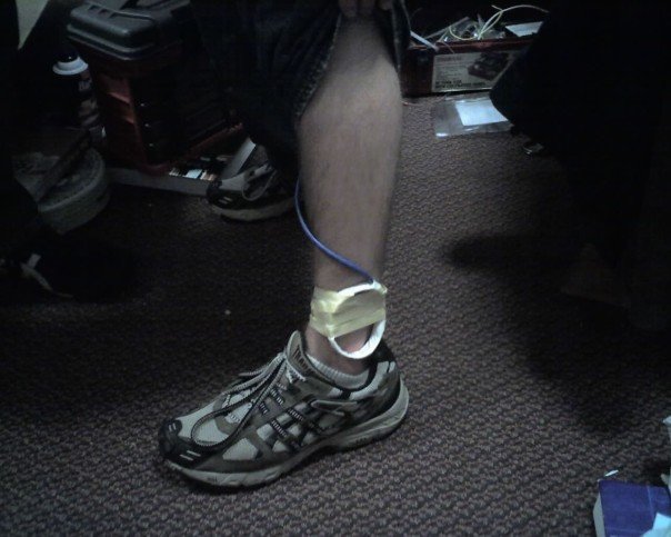 The transmitter was in my pocket with two switches: to select between lock and unlock, and to active the coil. Since the coil was down at my ancle, this waranted a wire up my pants.