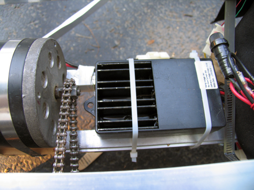 My girlfriend Erica is building a kart on the same design as this one. I helped her get her motor… hers is 1200w. I think I’ll still be able to beat her once I figure out how to put some sort of transmission on this thing. The chain and rear cog are from the scooter too.