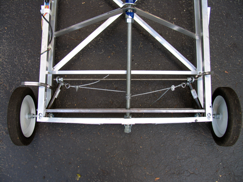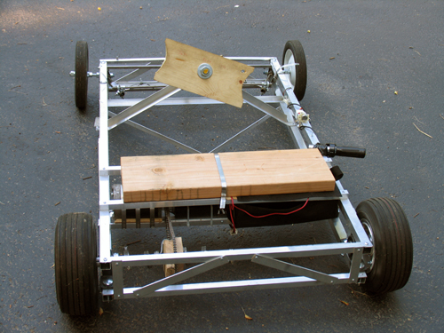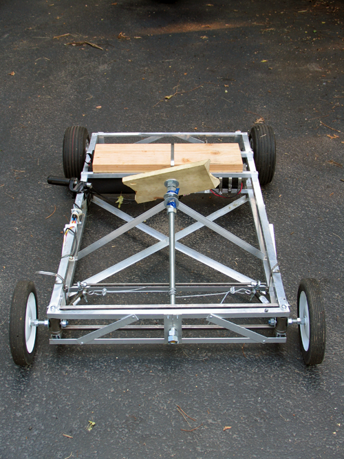 The steering idea was conceived by Sean Manix and Joe Gage in a gravity-powered car we built long ago. I modified the design somewhat to work here. Basically, the system works as a rack and pinion system does, minus the rack and the pinion. The tierod keeps outward tension on the steering arms so that they stay the proper distance apart and the wheels stay parallel; the wire pulls the whole sytem to one side or the other to steer while at the same time keeping tension on the steering arms so they stay on the tierod.