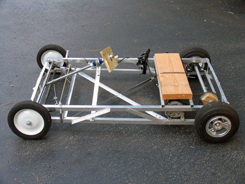 Update: Now that I actually know how to machine things, I’m going to revamp the Kart next time I’m home. Real bearings for the steering assembly, pedals and a floorboard, etc. Should be interesting…