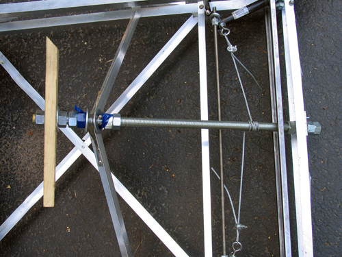 The cross peices that go between the frame sides in the front are 1/2″ inch steel square stock. It is absolutly key that these side sections stay the same distance apart, as they control the cambre of the wheels. The steel is held in place by threaded rod. (I would have used aluminum, but Home Depot is terrible at restocking and never had enough.)